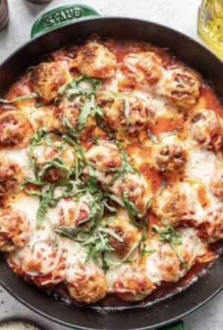 - Once all the meatballs are browned, add them all back to the pan and pour over the sauce. Cover with shredded mozzarella and bake for 10-15 minutes until cheese is melted and bubbly and the meatballs are cooked through.